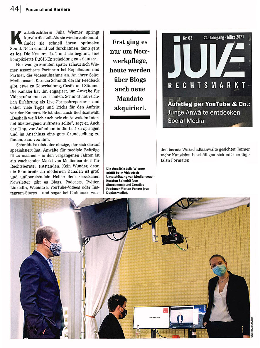 Mein Social Media Kameratraining für Anwälte wurde auch in diesem Artikel in der JUVE publiziert …